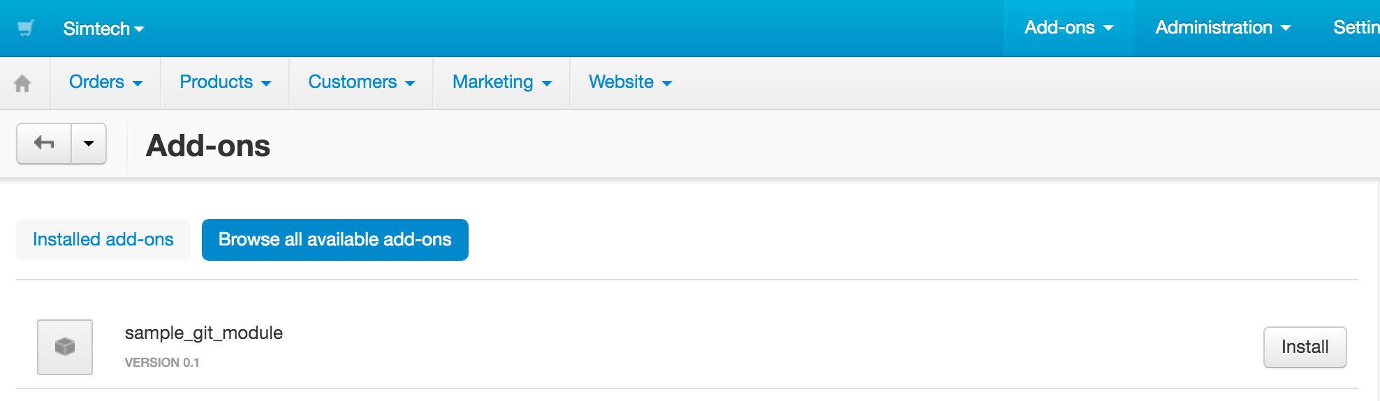 В результате в каталоге с установленным CS-Cart появится каталог app/addons/sample_git_module, который содержит ранее созданные файлы addon.xml и controllers/frontend/sample_git.php, при этом являясь лишь символической ссылкой на оригинальный каталог, расположенный по пути ~/dev/vagrant/repos/sample_git_module/app/addons/sample_git_module.