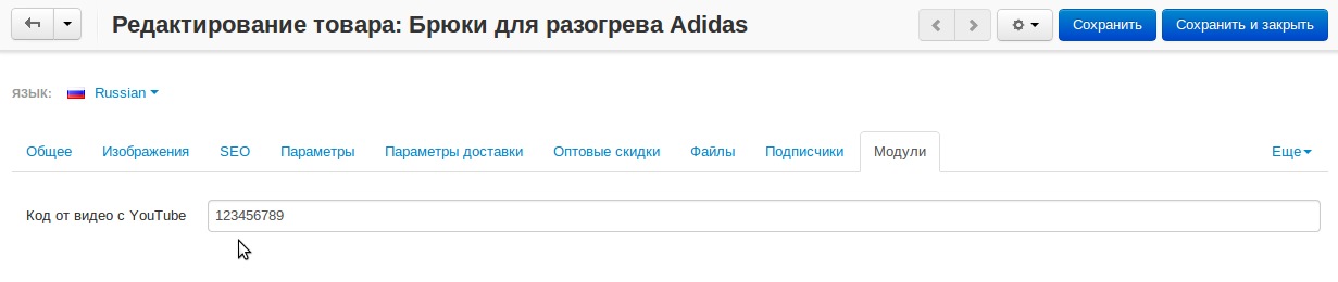 7. Проверим, сохраняются ли данные из настройки “Код от видео с YouTube” на странице редактирования товара.