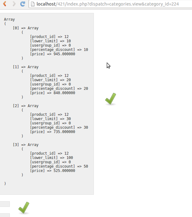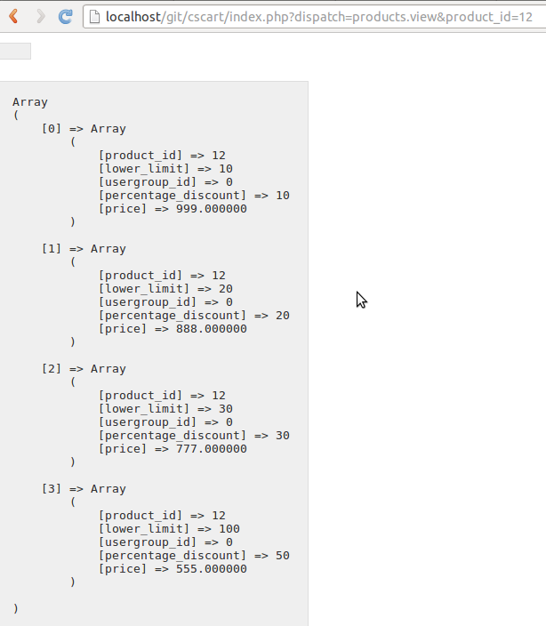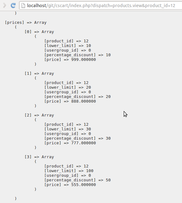 // Get qty discounts if ($get_qty_discounts == true) { fn_print_r($product_data['prices']); fn_get_product_prices($product_id, $product_data, $auth); fn_print_r($product_data['prices']); }
