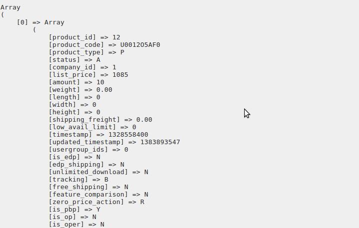 fn_print_r($product);` чтобы распечатать на экран переменную ``$productкоторая появляется в результате работы функцииfn_get_product_data1 2 3