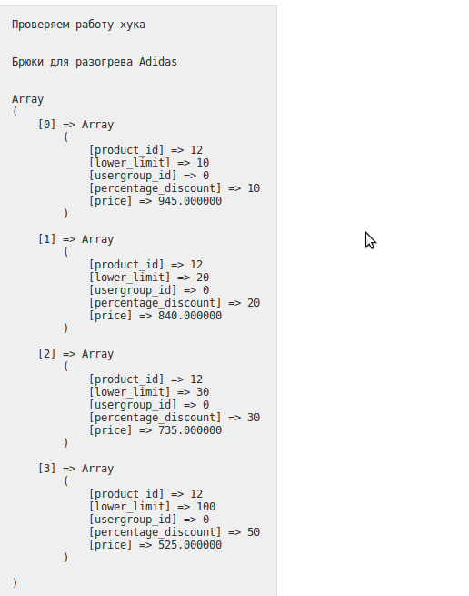 $productsпосле функции и изучаем массив с данными.К сожалению, информации о оптовых скидках не появилось. У функции есть параметр