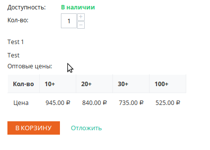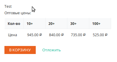 Наша задача отобразить оптовые скидки на странице списка товаров. Оптовые скидки отображаются в карточке товара, изучим как это происходит и сделаем тоже самое со списком товаров.