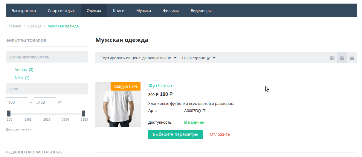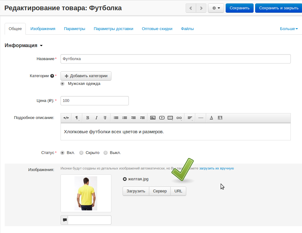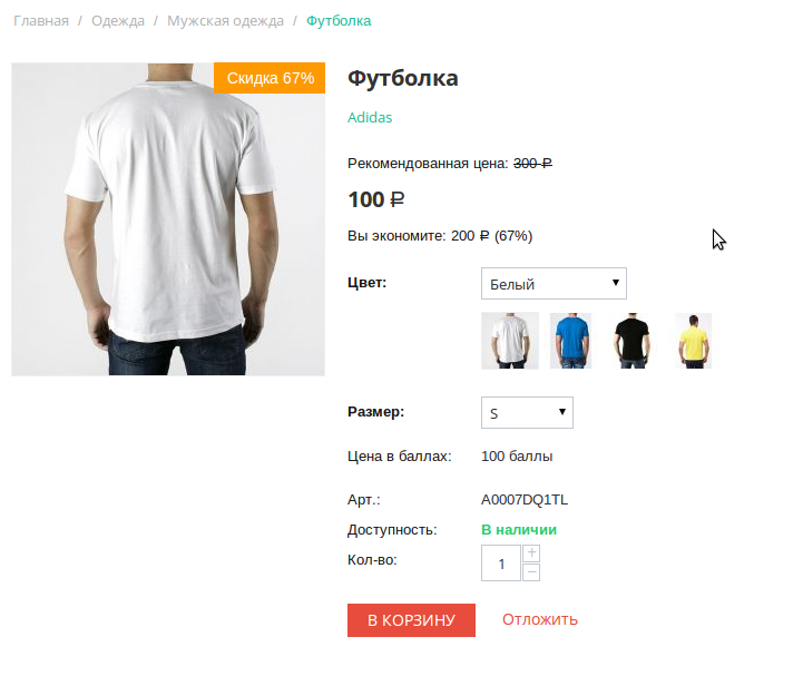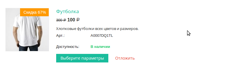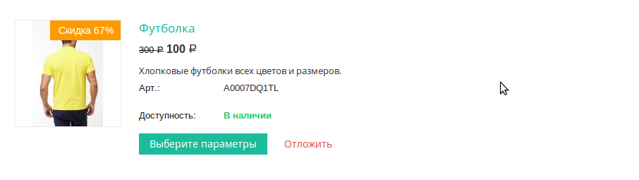 В данной ситуации первой по порядку будет отображена белая футболка как самая дешёвая. Мы сделаем так, чтобы отображалась основная картинка товара - желтая футболка.
