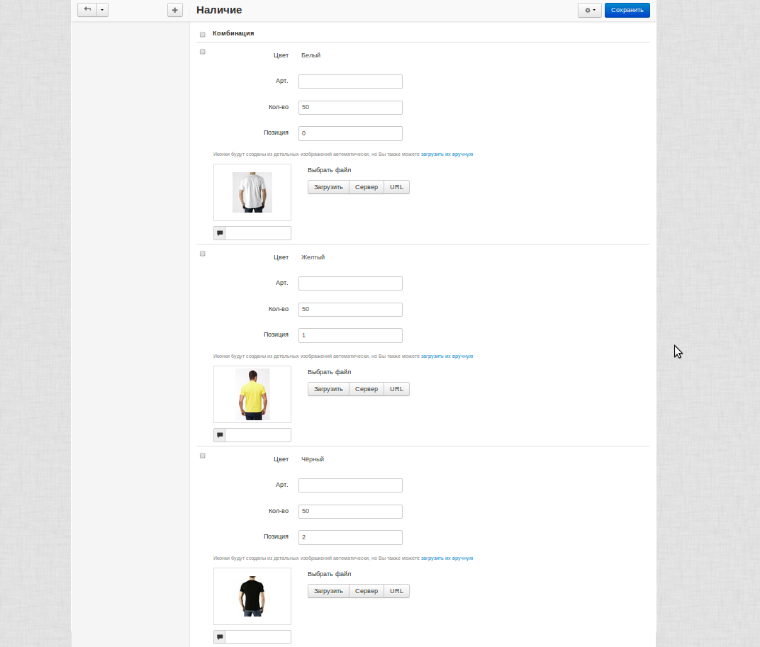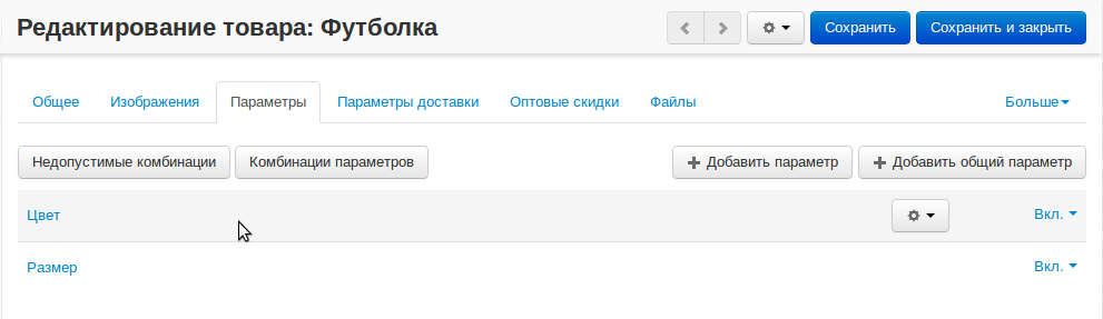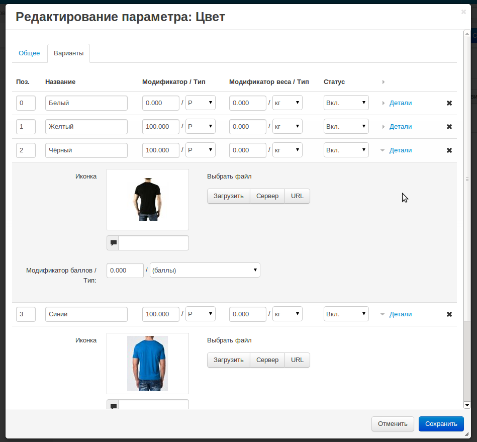В стандартной функциональности каждый товар имеет основное изображение, которое отображается первым на всех страницах. У товара могут быть различные параметры и комбинации параметров, например “Цвет” и “Размер”. Для каждого параметра и комбинации параметров можно задать своё изображение. Если у товара настроены изображения для комбинаций параметров, то на всех страницах будет отображаться изображение первой комбинации (порядок можно настраивать).