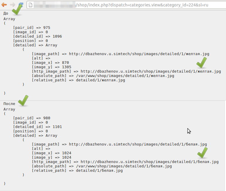 if ($product_id == 7) { fn_print_r('До', $product['main_pair']); } if (!empty($params['get_icon']) || !empty($params['get_detailed'])) { // Get product options images if (!empty($product['combination_hash']) && !empty($product['product_options'])) { $image = fn_get_image_pairs($product['combination_hash'], 'product_option', 'M', $params['get_icon'], $params['get_detailed'], CART_LANGUAGE); if (!empty($image)) { $product['main_pair'] = $image; } } } if ($product_id == 7) { fn_print_r('После', $product['main_pair']); }