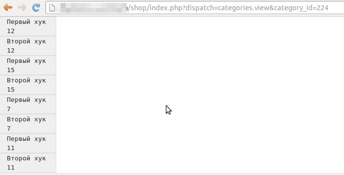 fn_print_r()и добавляем функции печати в хуки файлаapp/addons/my_changes/func.phpfunction fn_my_changes_gather_additional_product_data_before_options(&$product, &$auth, &$params) { fn_print_r('Первый хук', $product['product_id']); } function fn_my_changes_gather_additional_product_data_before_discounts(&$product, &$auth, &$params) { fn_print_r('Второй хук', $product['product_id']); }
