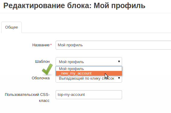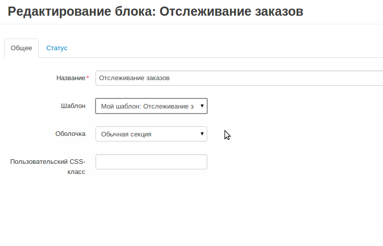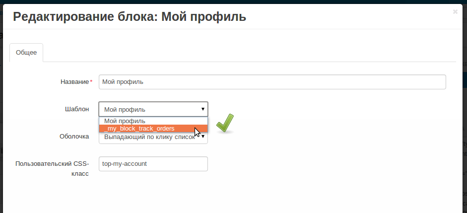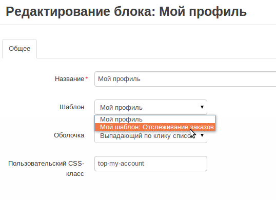Мы создадим новый шаблон для блока «Мой профиль» на основе существующего. У блока будет два шаблона, выбор шаблона будет доступен в панели администратора. Новый шаблон блока будет выполнять одну единственную функцию — отследить заказ.