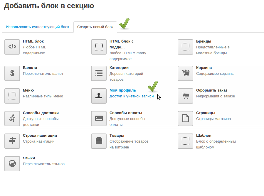 Создаём новый блок «Мой профиль» или находим существующий: