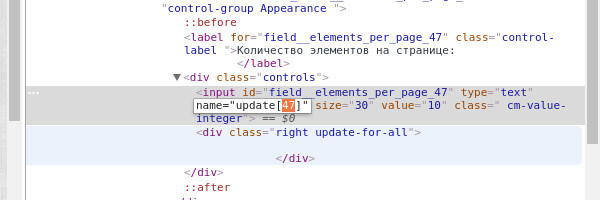 Чтобы узнать идентификатор настройки, нужно посмотреть HTML-код страницы с настройкой. Например, узнаем идентификатор настройки elements_per_page (Elements per page, Количество элементов на странице) из раздела Settings → Appearance (Настройки → Внешний вид).