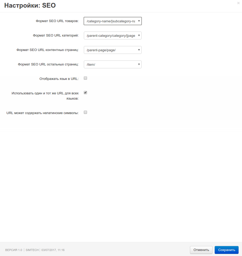 Например, вот настройки модуля SEO: