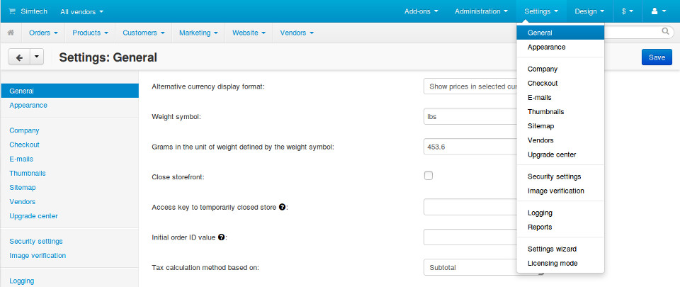 Настройки в CS-Cart бывают двух типов: