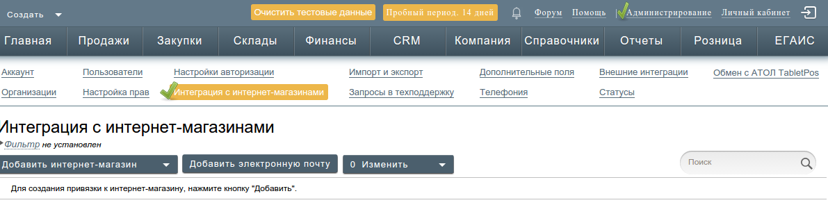 Зайдите в “Администрирование” → “Интеграция с интернет-магазинами”.
