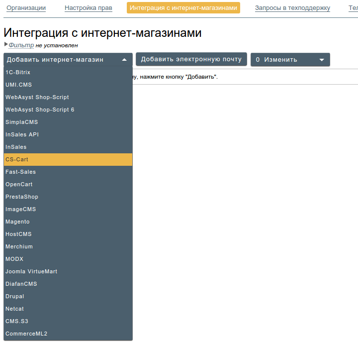 В окне интеграции добавьте новый магазин “Добавить интернет-магазин” → “CS-Cart”.