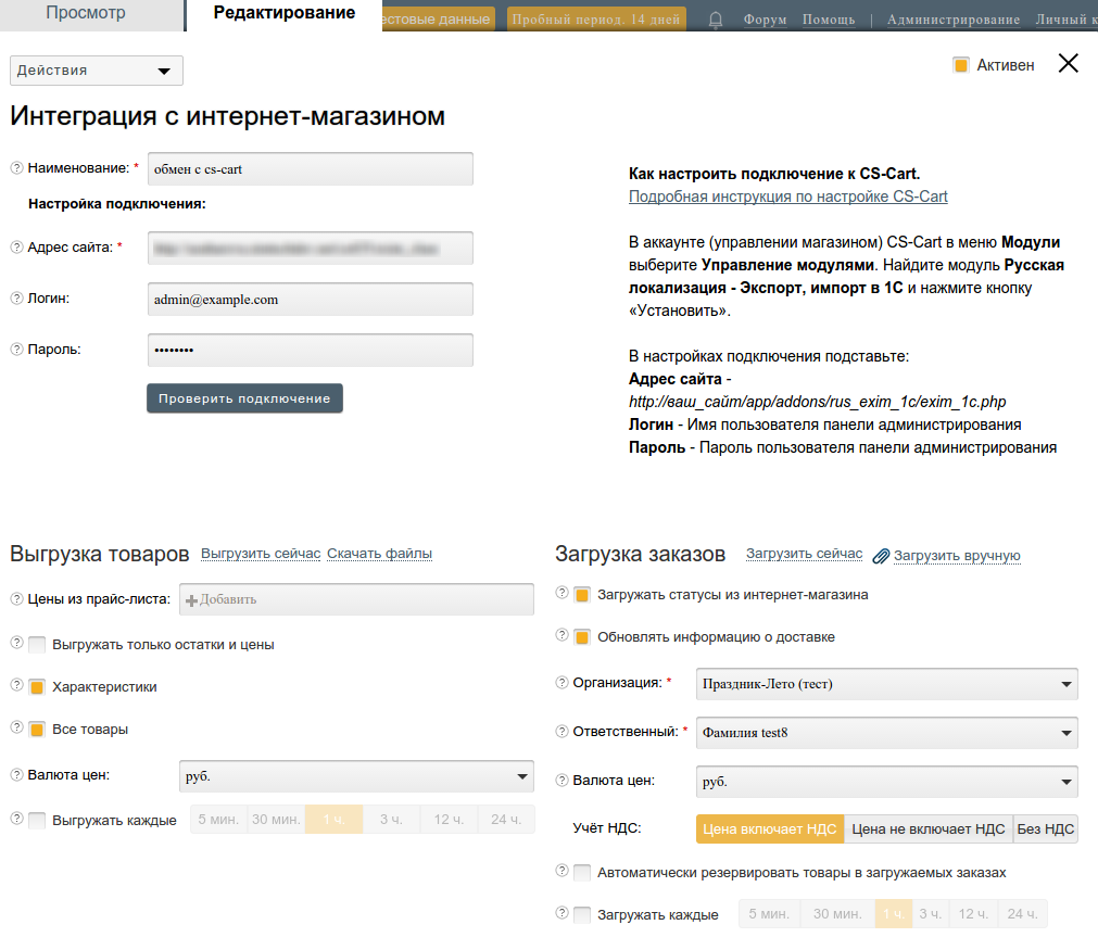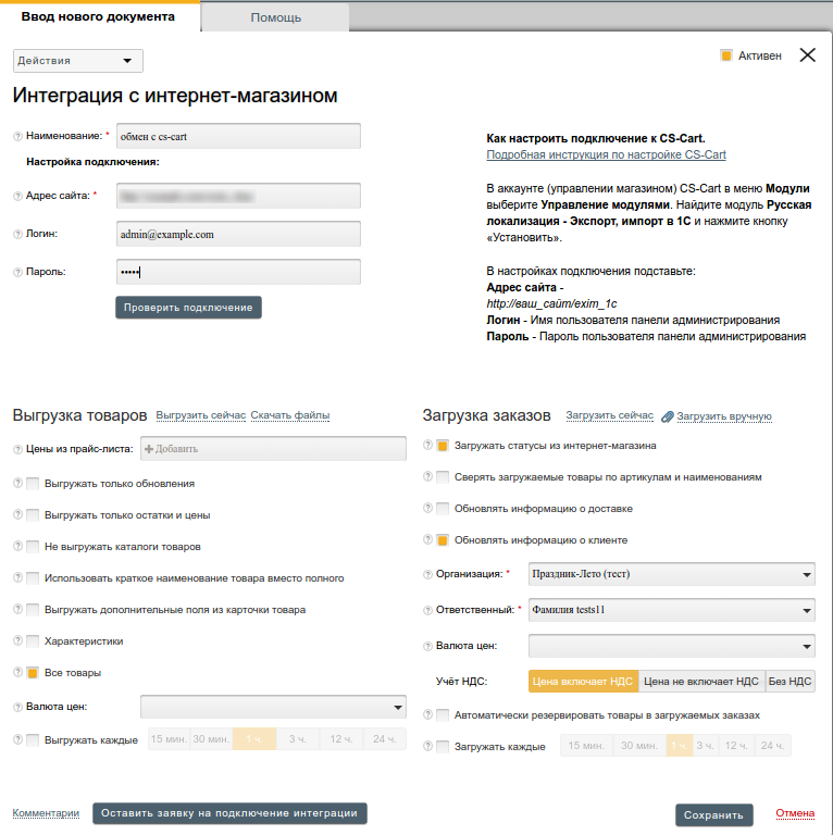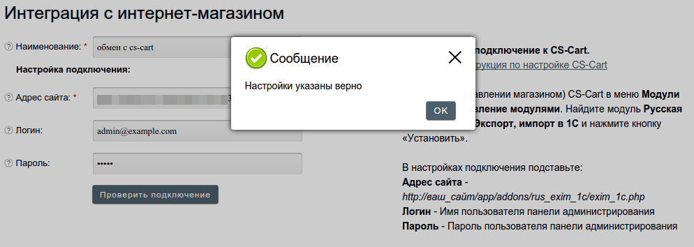 - Адрес магазина — адрес скрипта в магазине, который будет обрабатывать выгружаемые файлы. Его можно увидеть в настройках обмена на стороне CS-Cart; обычно он выглядит наподобие https://example.com/commerceml.