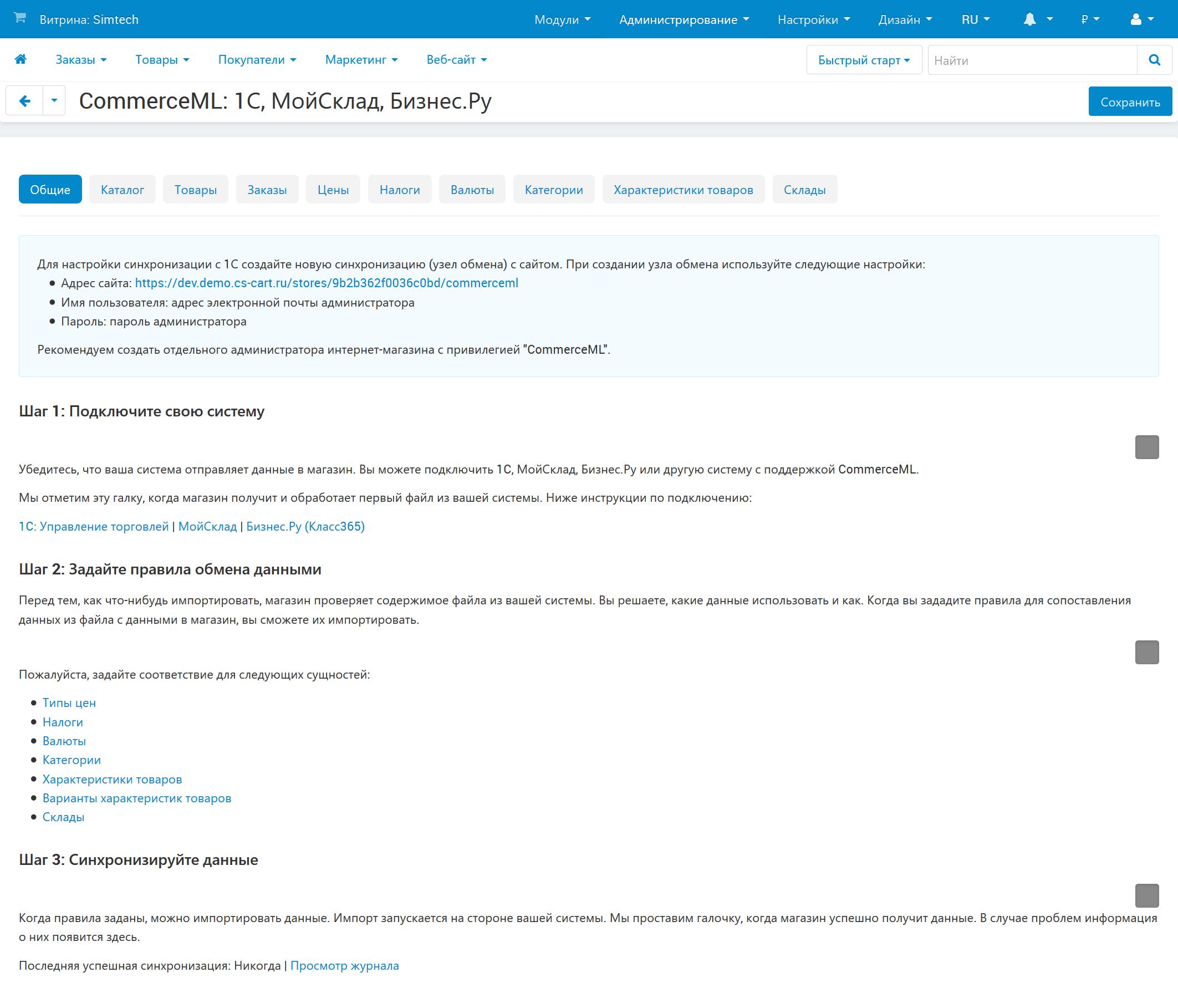 После того, как вы установите модуль, в меню Администрирование появляется пункт Синхронизация данных. Там есть раздел CommerceML: 1С, МойСклад, Бизнес.Ру. Все настройки на стороне CS-Cart выполняются в нём. В Multi-Vendor этот раздел доступен для продавцов. Процесс разбит на 3 шага. Первые два шага понадобится делать не всегда; возможно, только один раз.
