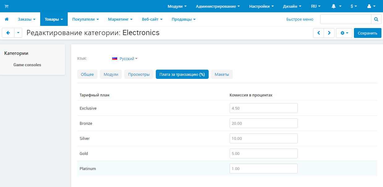 Комиссии из модуля “Тарифные планы для продавцов” распространяются на все товары, независимо от их категорий. Если вы хотите установить разную комиссию для разных категорий, используйте модуль Тарифные планы для продавцов: Комиссии для категорий.