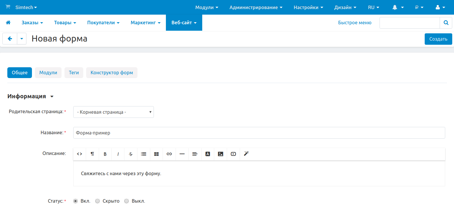 • Родительская страница — выберите для формы родительскую страницу.