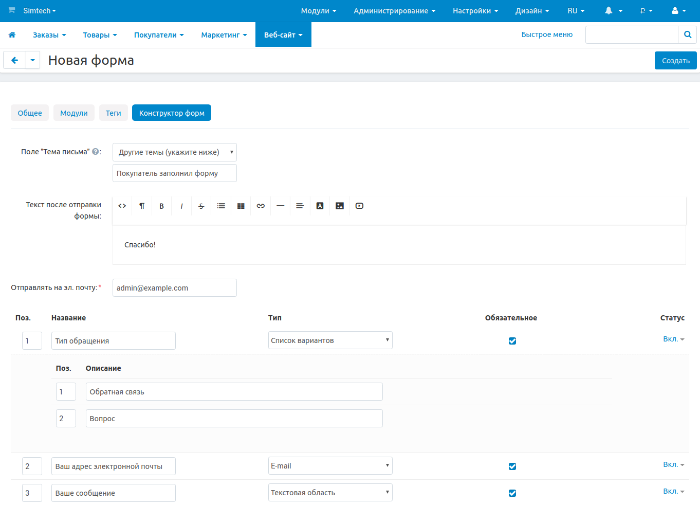 6. (опционально) Заполненные формы отправляются по электронной почте на указанный адрес. Вы можете установить одно из полей формы в качестве темы письма.