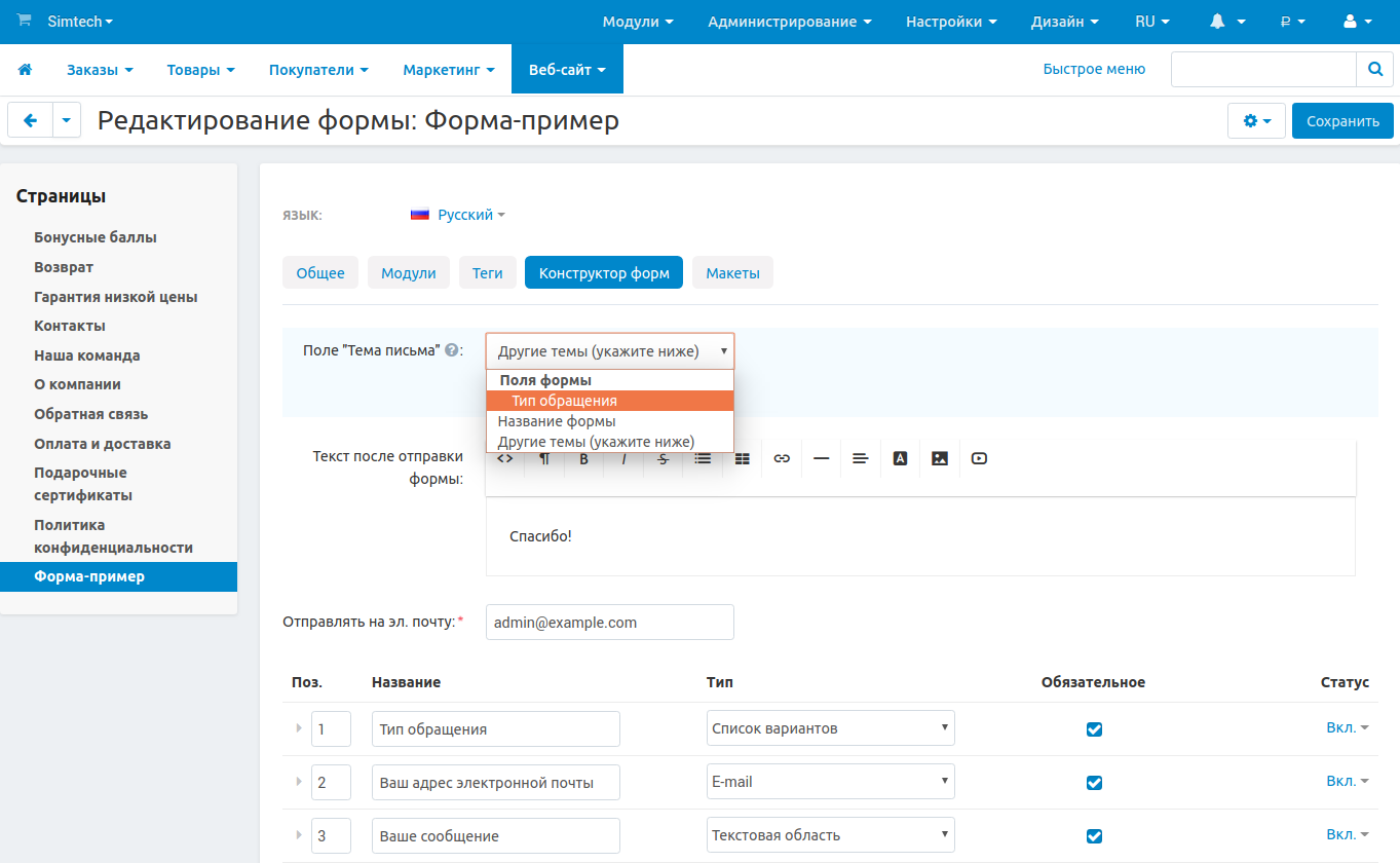 Когда вы редактируете уже созданную форму, в настройке Поле “Тема письма” появляется возможность выбрать одно из полей формы. Данное поле должно иметь один из следующих типов: