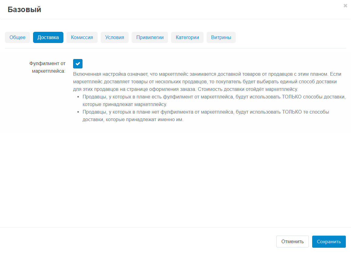 4. Нажмите Сохранить. Теперь все товары от продавца с этим планом будет доставлять маркетплейс.