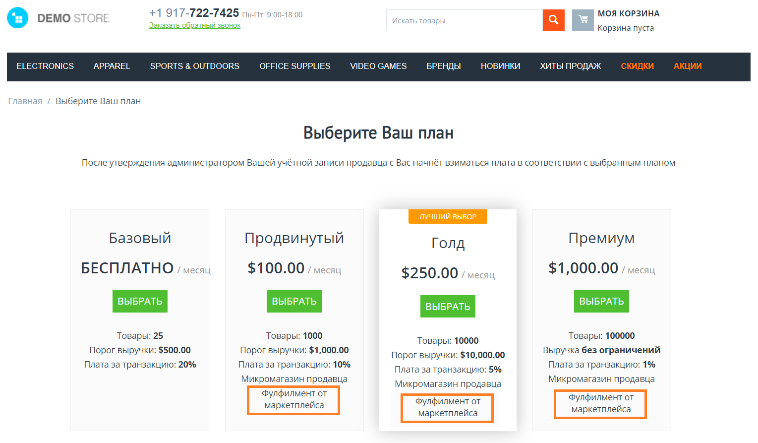 Другие сценарии реализуются модулем “Фулфилмент от маркетплейса [Beta]”. Так как услуга фулфилмента стоит маркетплейсу денег, то эту стоимость можно включить в тарифные планы. Когда в магазине работает модуль, продавцы еще на этапе регистрации видят, какие тарифные планы имеют преимущество в виде фулфилмента.