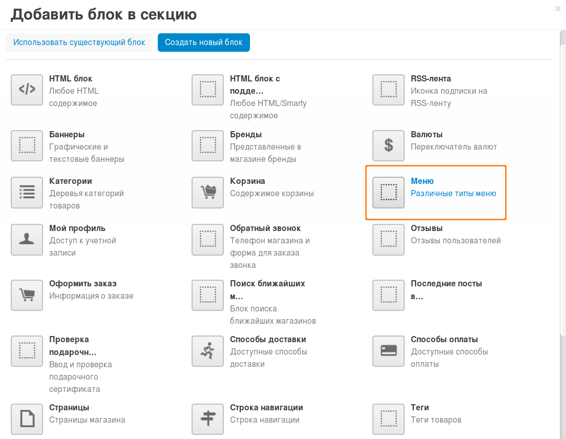2.4. Откроется всплывающее окно. Перейдите на вкладку Создать новый блок и выберите Меню.