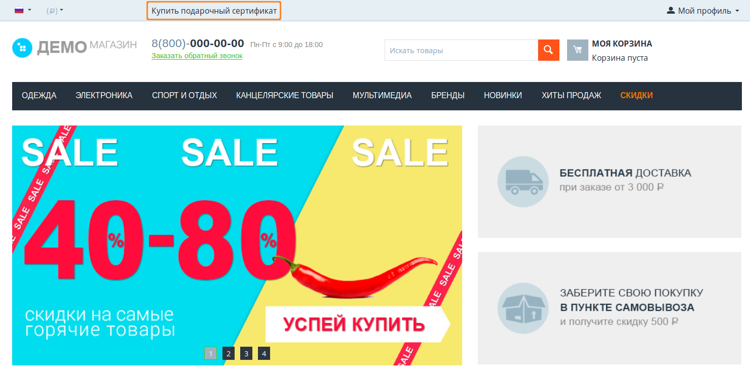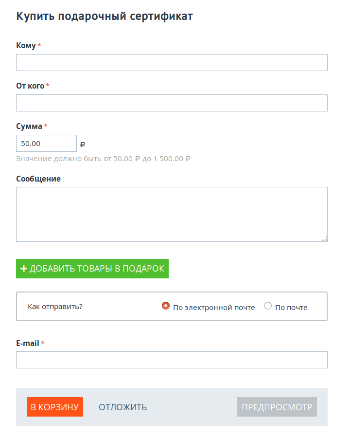 Модуль Подарочные сертификаты добавляет специальную страницу, на которой пользователи могут создавать подарочные сертификаты, добавлять их в корзину и покупать их как обычные товары.