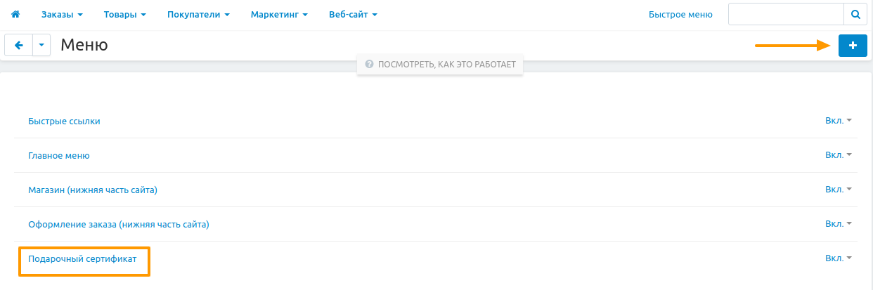 1.3. Откроется всплывающее окно. Задайте название меню (например, Подарочный сертификат) и установите статус Вкл., а затем нажмите Создать. Вы увидите в списке новое меню.