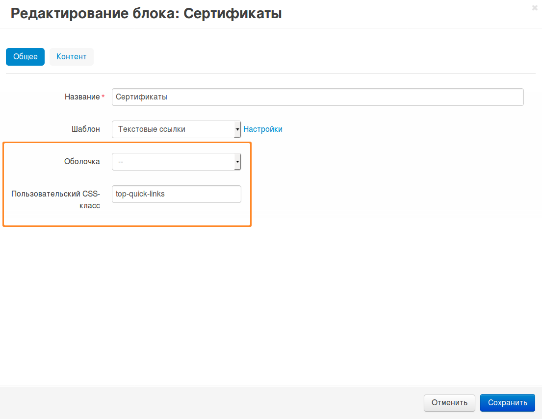 • Общее — введите название блока (например, Сертификаты) и тип меню (Текстовые ссылки).