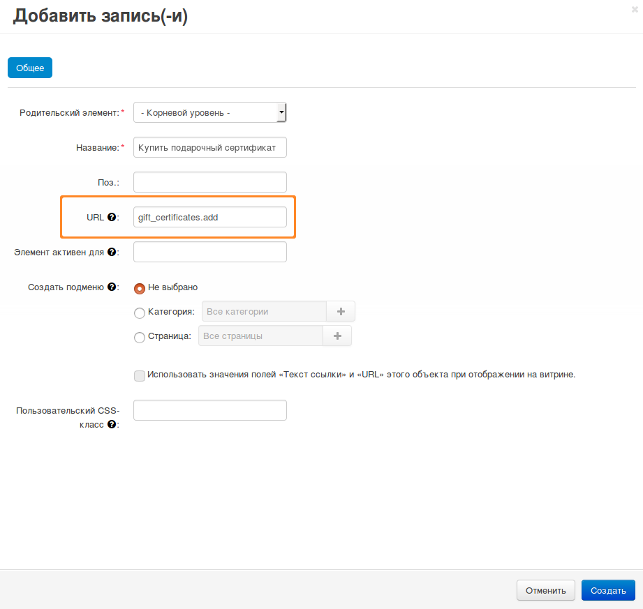 Ссылки на страницу подарочных сертификатов может не быть в вашем магазине — в этом случае можно добавить её вручную.