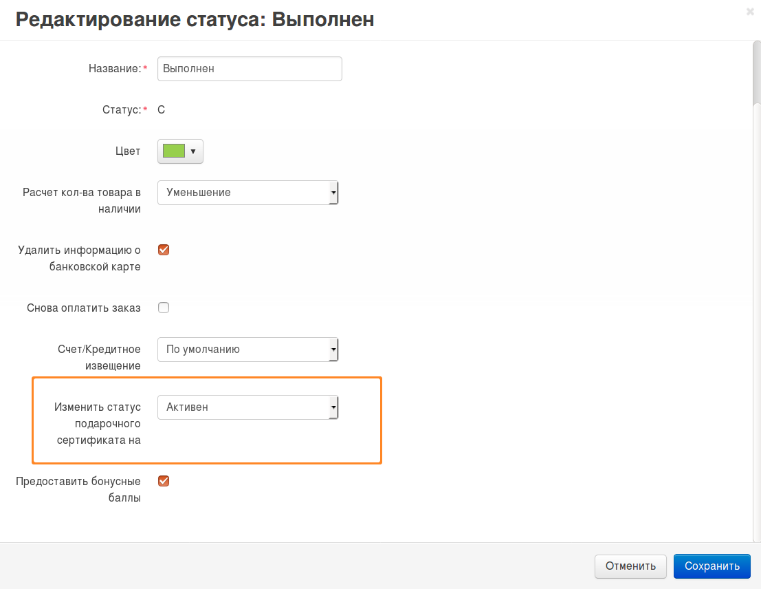 Нажмите Сохранить. Теперь, когда заказ получит этот статус, то статус подарочного сертификата изменится соответствующим образом.
