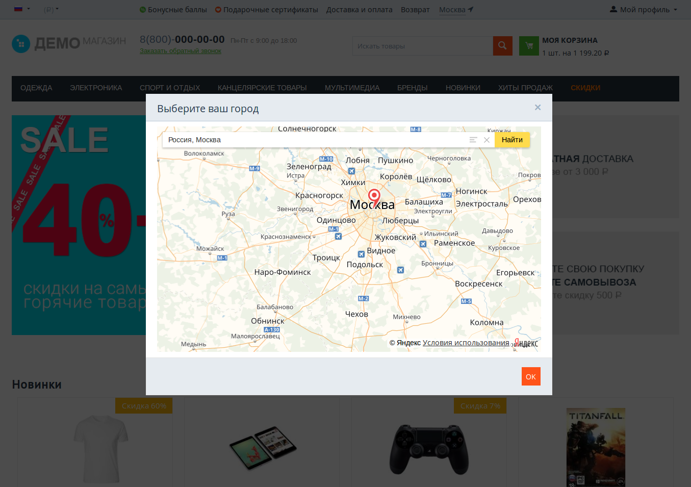 Уже на главной странице магазина есть блок Местоположение покупателя (за него отвечает одноимённый модуль). Этот блок автоматически определяет город покупателя и позволяет выбрать другой.