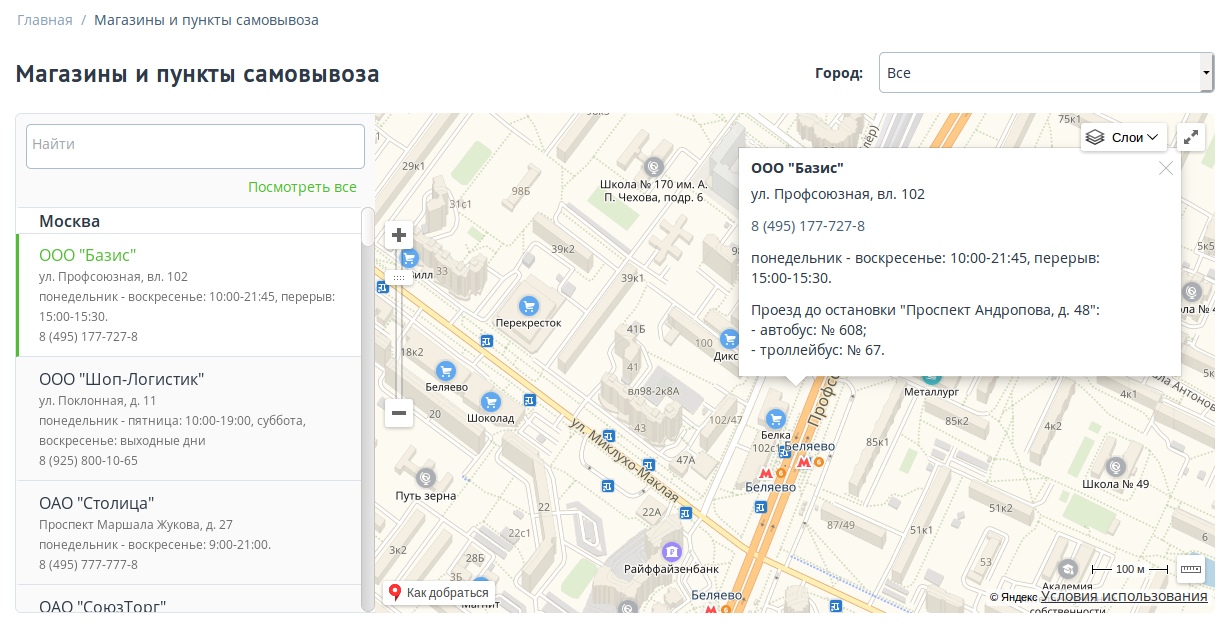 - список магазинов и пунктов самовывоза из соответствующего модуля.
