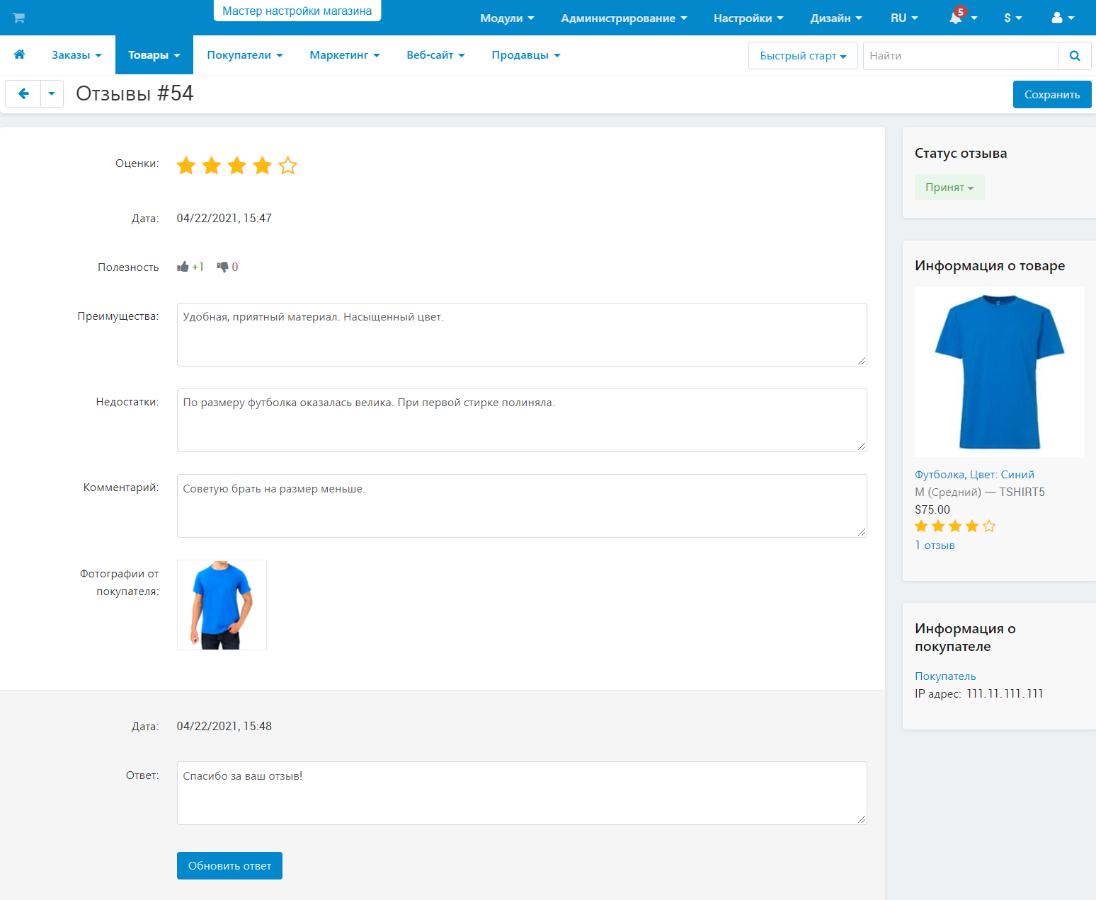 Здесь администратор может принять или не принять отзыв, просмотреть фотографии к отзыву, оценки отзыва, а также информацию о покупателе. Здесь можно также добавить ответ на отзыв.