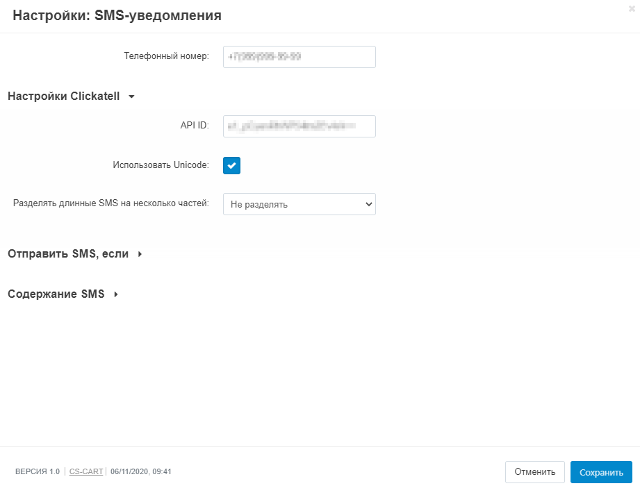 12. Откройте настройки модуля “SMS-уведомления” и вставьте значение ключа в поле API ID.