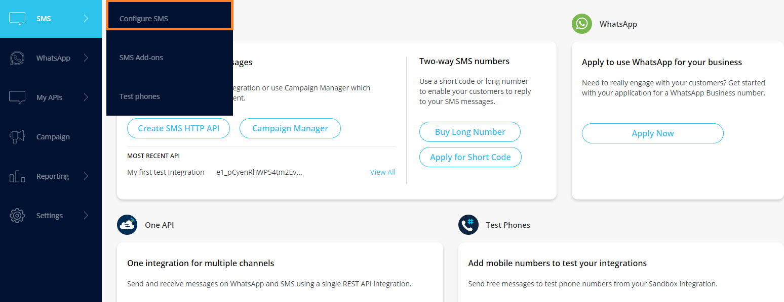 2. Кликните SMS на боковой панели и выберите Configure SMS.