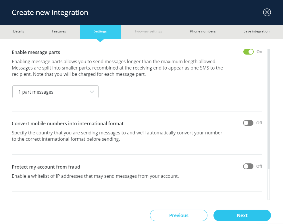 8. На вкладке Settings включите Enable message parts. Это позволит отправлять сообщения, длина которых превышает максимальное число знаков. Остальные функции оставьте выключенными.