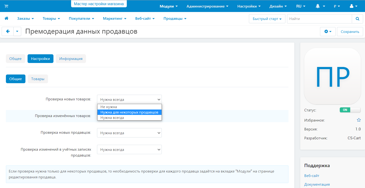 Модуль Премодерация данных продавцов установлен по умолчанию.