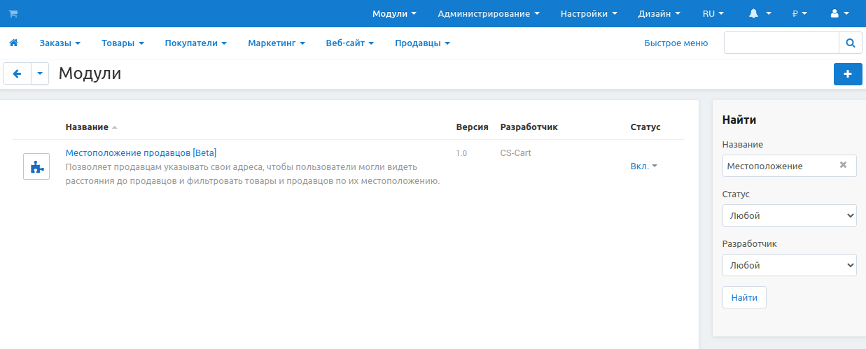 Модуль “Местоположение продавцов [Beta]” позволяет покупателям указывать своё местоположение, чтобы увидеть ближайших к ним продавцов отфильтровать товары по удаленности. Кроме того, модуль отображает продавцов на карте, а также позволяет фильтровать продавцов по городам.