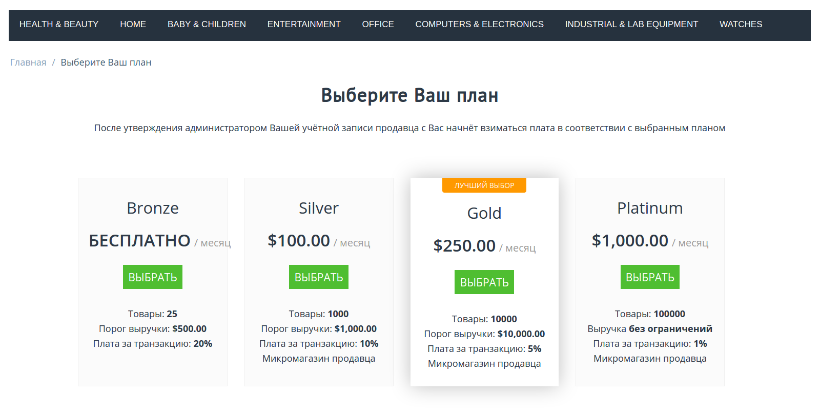 Модуль Тарифные планы для продавцов позволяет вам создавать тарифные планы для ваших продавцов. У этих тарифных планов могут быть ограничения по количеству товаров, доходам, разрешенным категориям и т.д. В зависимости от того, как вы настроите модуль, продавцы смогут (или не смогут) самостоятельно переключаться на другие планы.