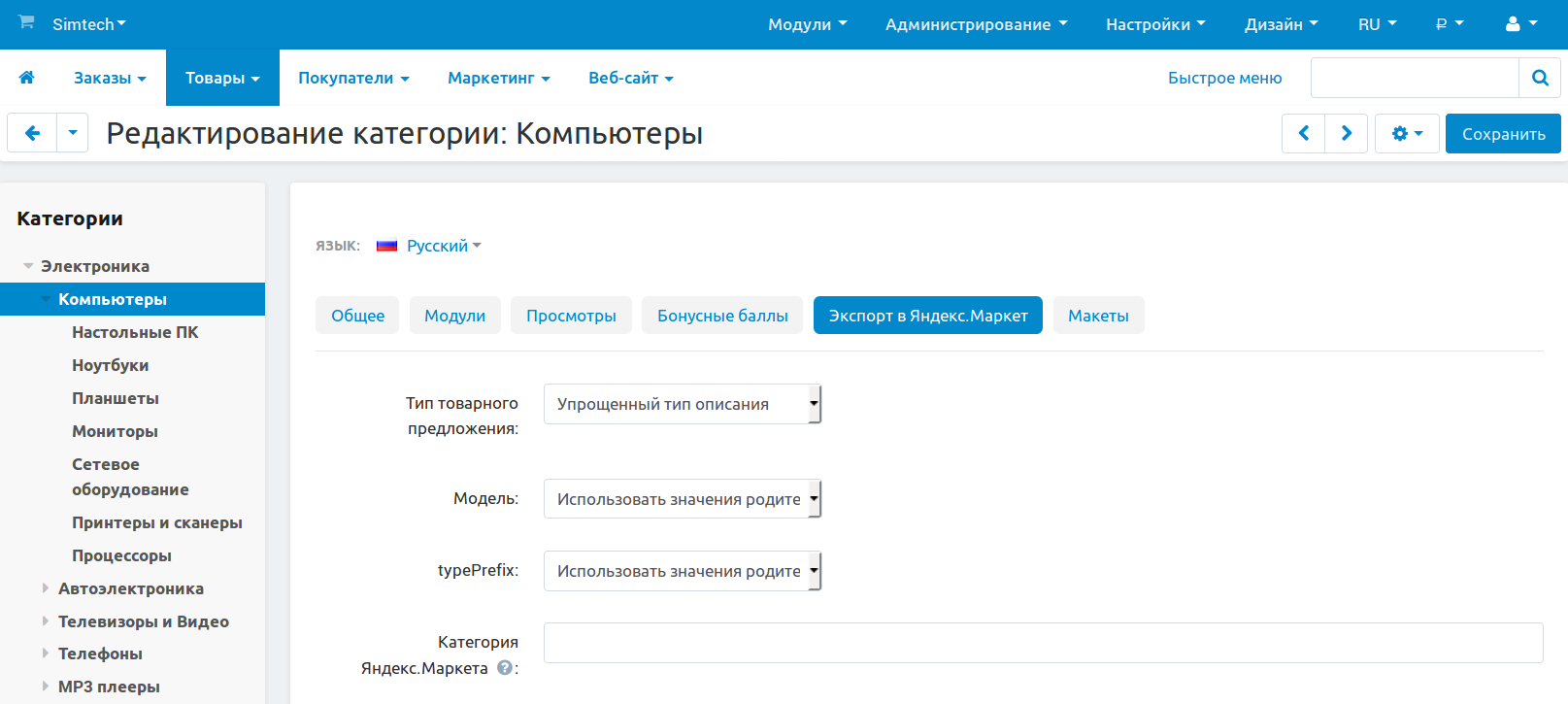 Модуль Экспорт в Яндекс.Маркет добавляет новые настройки для категорий интернет-магазина.