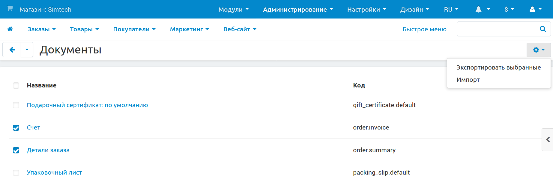<code>) документа вручную, а затем импортировать данный файл, будет создан новый документ. Хотя новый документ и будет отображаться в списке на панели администратора, он не будет использоваться, если нет модуля, который использует данный документ.Однако можно создать новые документы на основе экспортированных документов “Счёт” и “Детали заказа”. Такие документы потом можно прикрепить в виде PDF-файла к email-уведомлениям, касающимся изменений статуса заказа.