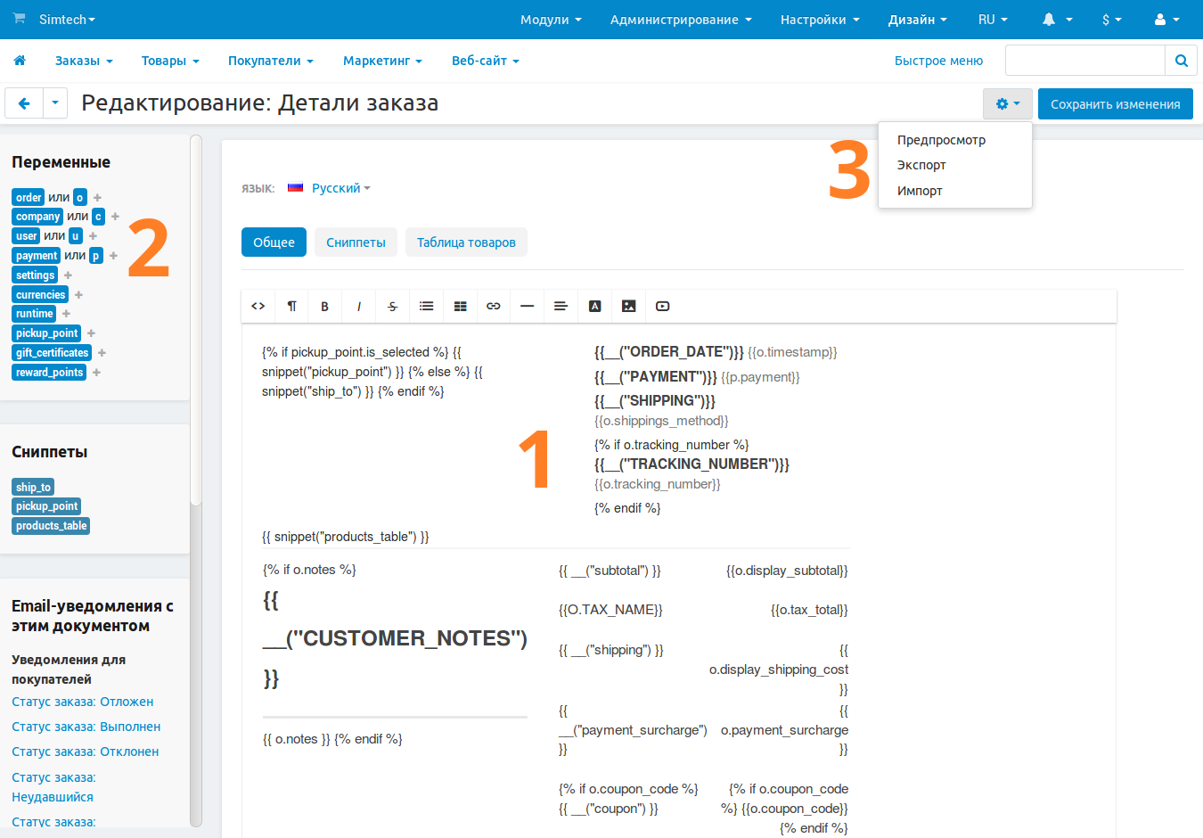 Основная область в центре страницы используется непосредственно для редактирования документов. По сути, документ представляет собой шаблон, который включает в себя переменные, языковые переменные, сниппеты и обычный текст. При создании документа из шаблона происходит замена переменных данными из магазина.