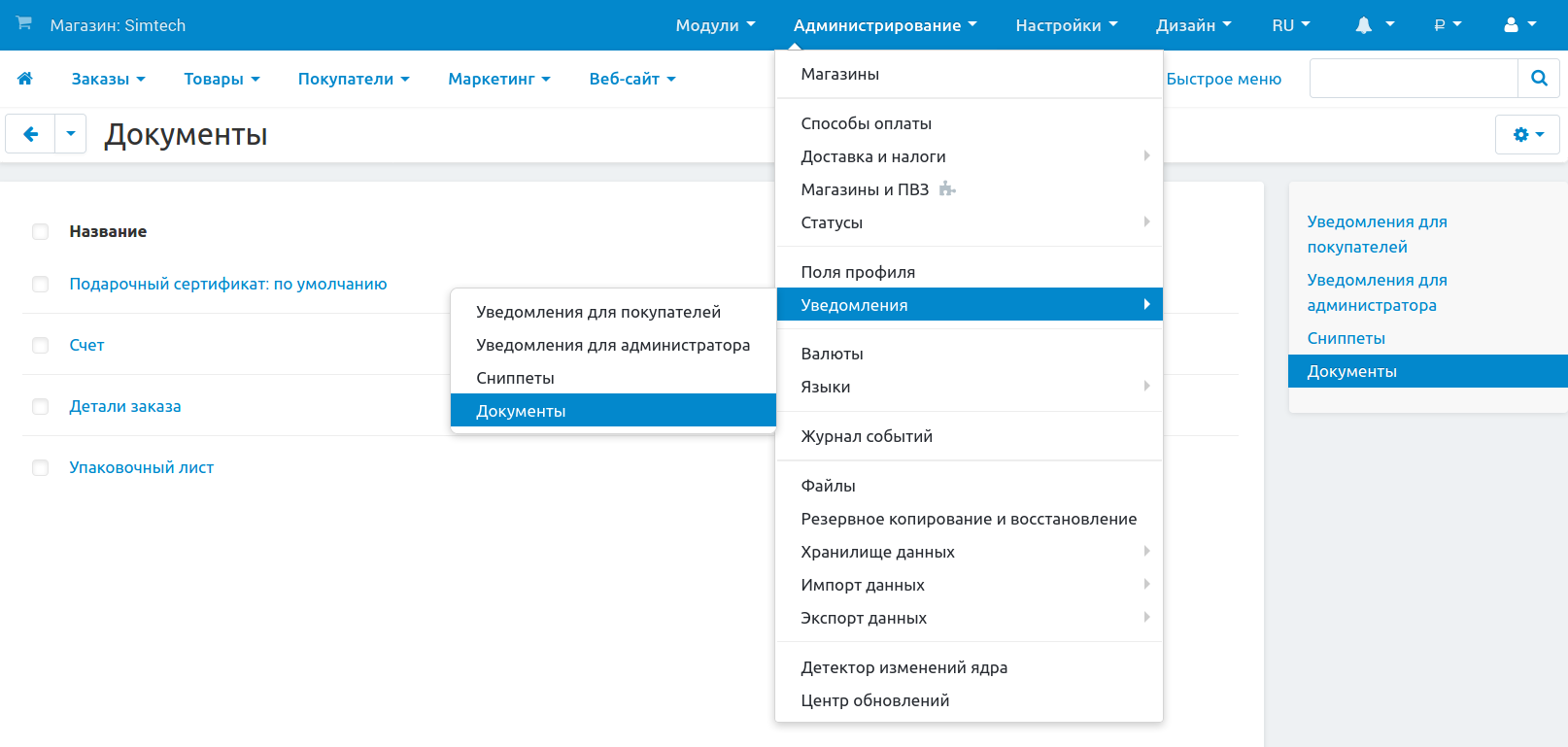 Для доступа к редактору шаблонов перейдите в меню Администрирование → Уведомления → Документы.
