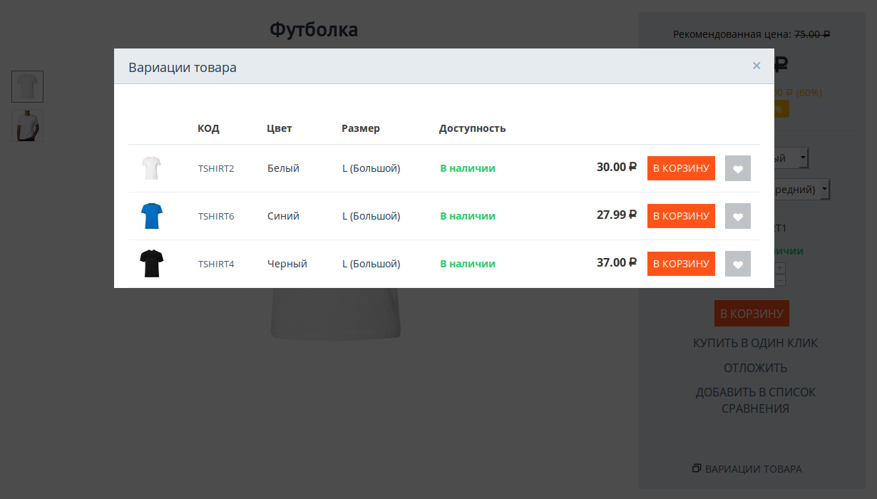 - добавить нужные вариации в корзину или в список отложенных товаров.