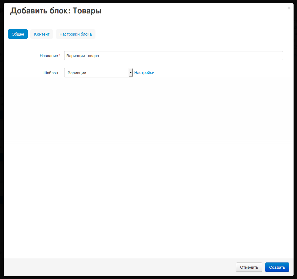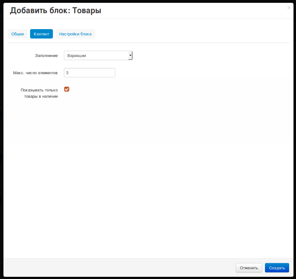 Откроется всплывающее окно добавления блока. Перейдите на вкладку Создать новый блок и выберите блок Товары.