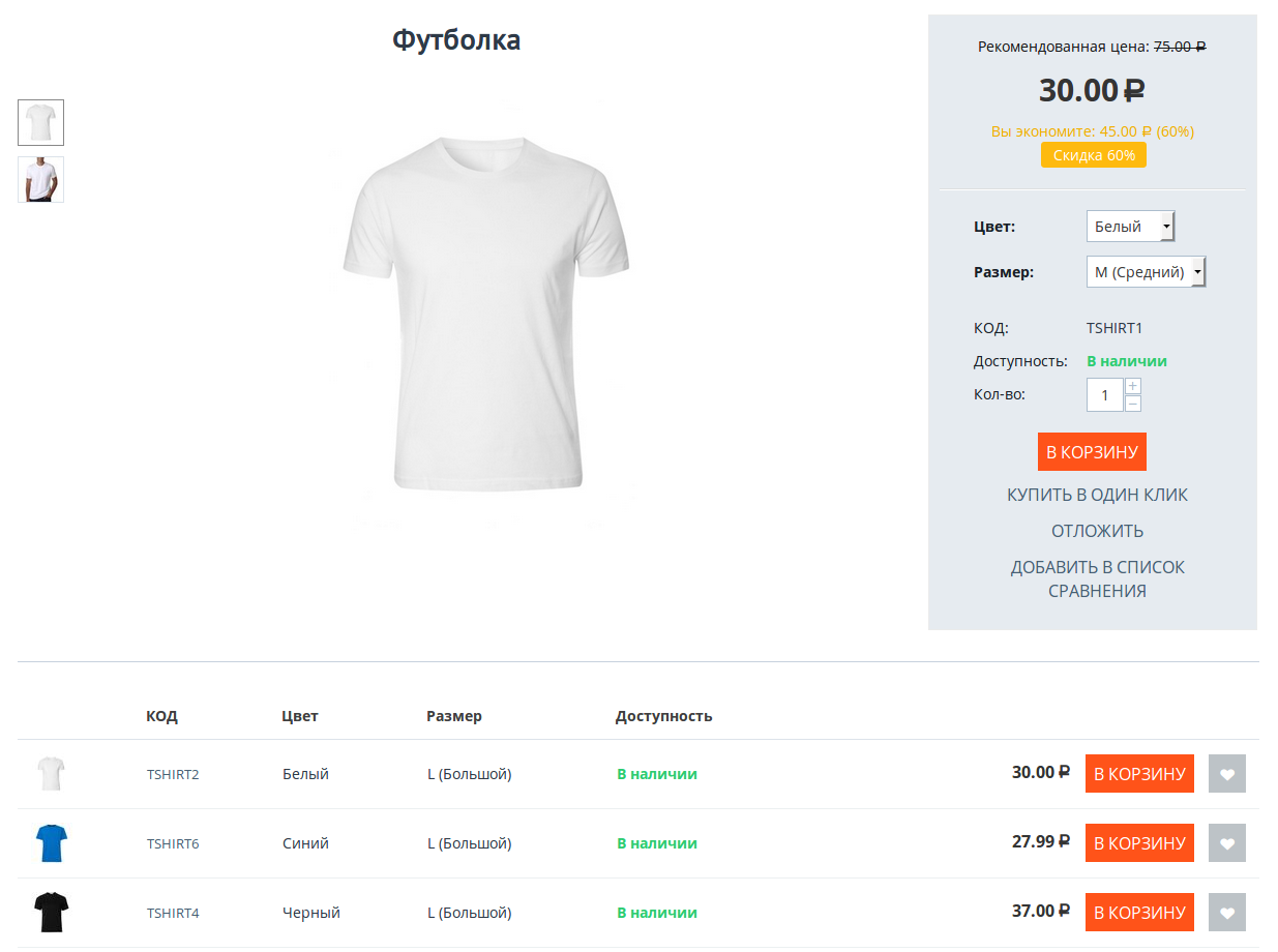 В CS-Cart есть возможность показать все существующие вариации товара на странице этого товара. Если раньше требовалось открыть страницу товара, а затем перебирать варианты опций, чтобы найти нужные и увидеть, есть ли они в наличии, то теперь покупатель сможет: