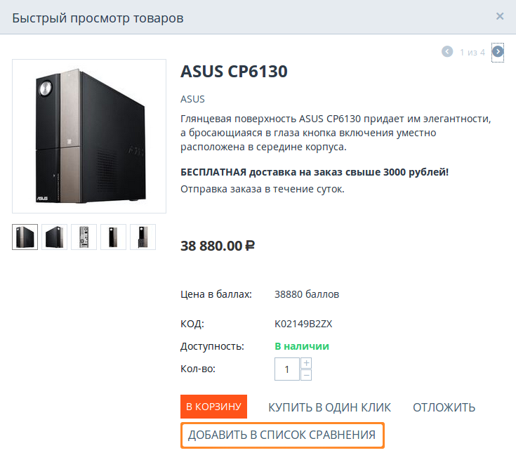 По умолчанию эта галочка уже проставлена. Это означает, что у каждого товара в магазине есть кнопка Добавить в список сравнения. Эта кнопка появится и на страницах товаров, и при во всплывающих окнах при быстром просмотре.