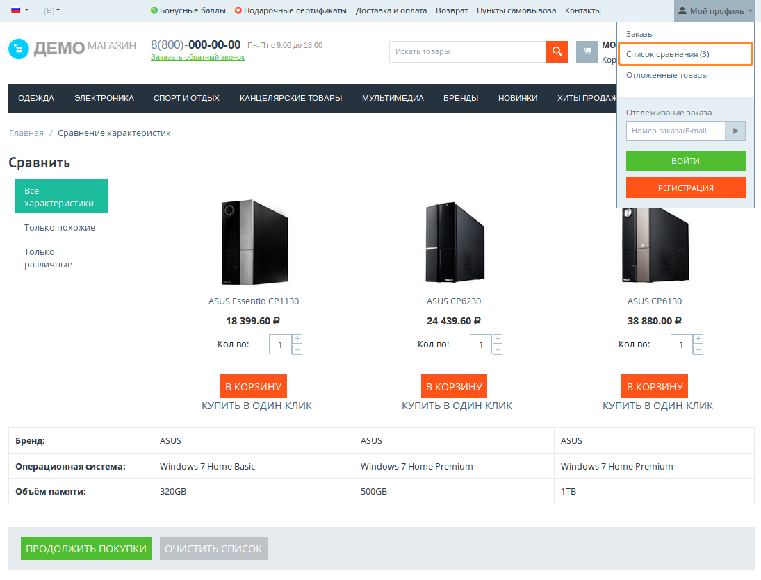 В CS-Cart и Multi-Vendor можно сравнивать характеристики товаров. Покупатели добавляют товары в список сравнения, и характеристики этих товаров отображаются в виде таблицы. В этой статье рассказывается, как включить список сравнения и определить, какие характеристики попадут в список сравнения.