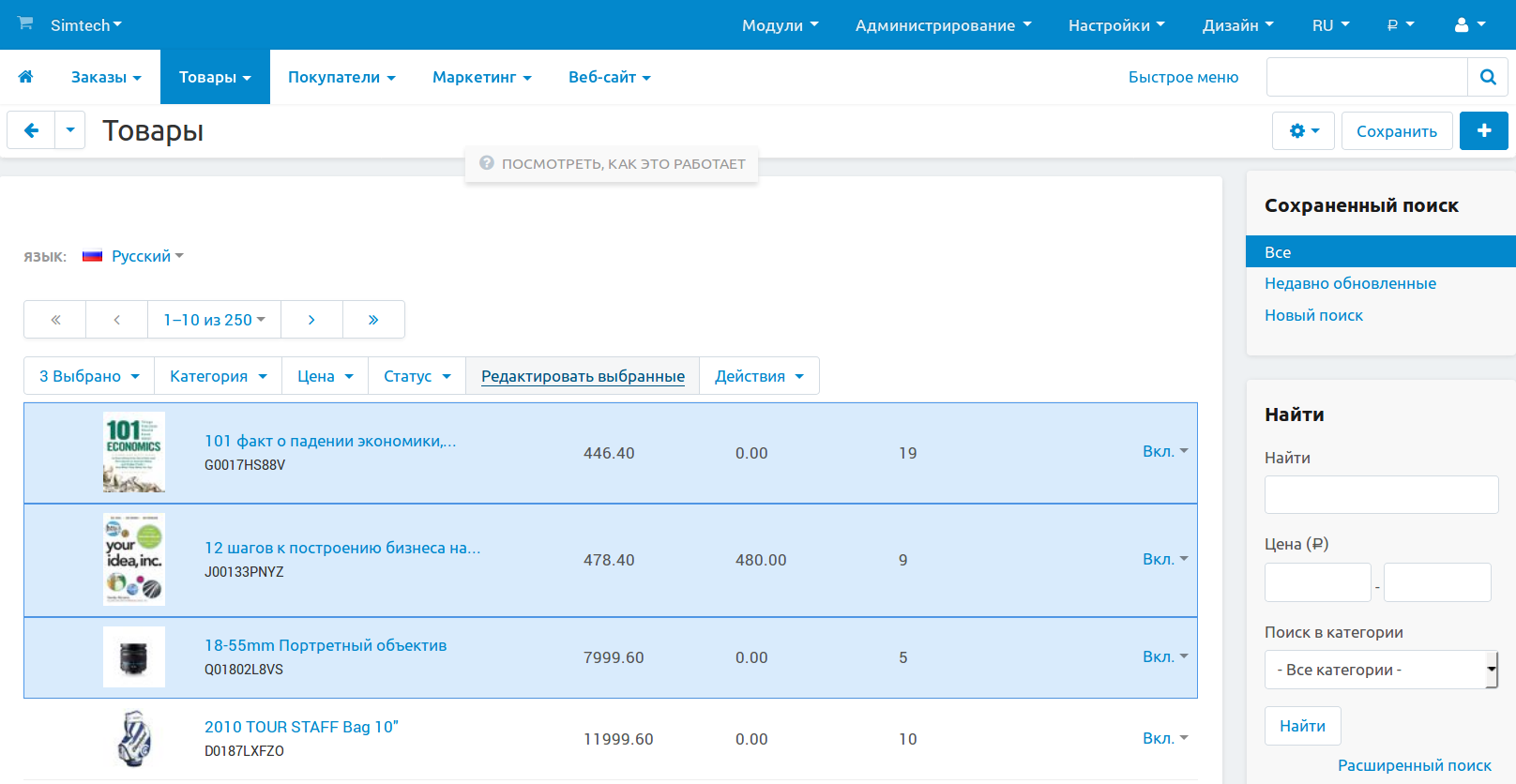 Нажмите кнопку Редактировать выбранные над списком товаров.